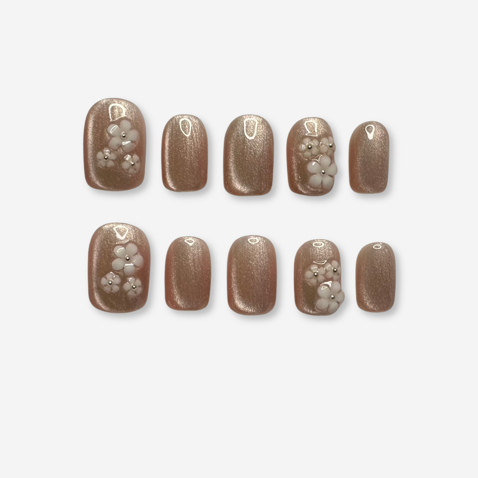 Embrace understated luxury with Blush Glam, a soft and sophisticated set of square press-on nails in a muted rose-gold hue. Elevated with 3D floral embellishments and a shimmering finish, these nails are perfect for adding a graceful touch to everyday wear or special occasions.